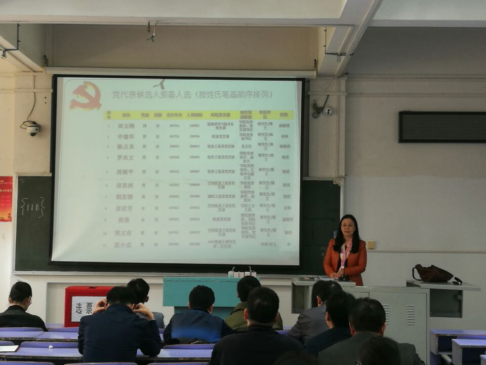 会议伊始,黄老师介绍了本次大会的主要议题,向学院党员介绍了田玉刚等11位党代表候选人。候选人中,唯一的一位学生党员叫霍少孟,2016年本科毕业于信息工程学院信息工程系,毕业后在江西赣州支教一年,并荣获江西省“优秀党员”称号,现为少妇