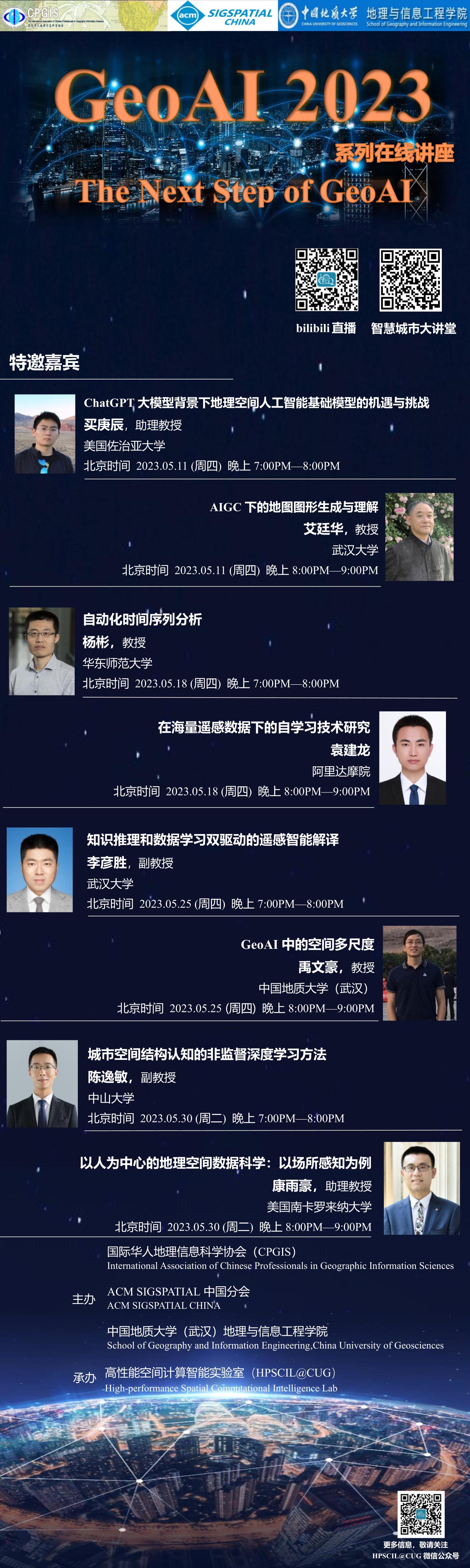 GeoAI 2023系列在线讲座,将于2023年5月11日至5月30日举行。本系列讲座由国际华人地理信息科学协会(CPGIS)、ACM SIGSPATIAL中国分会、少妇