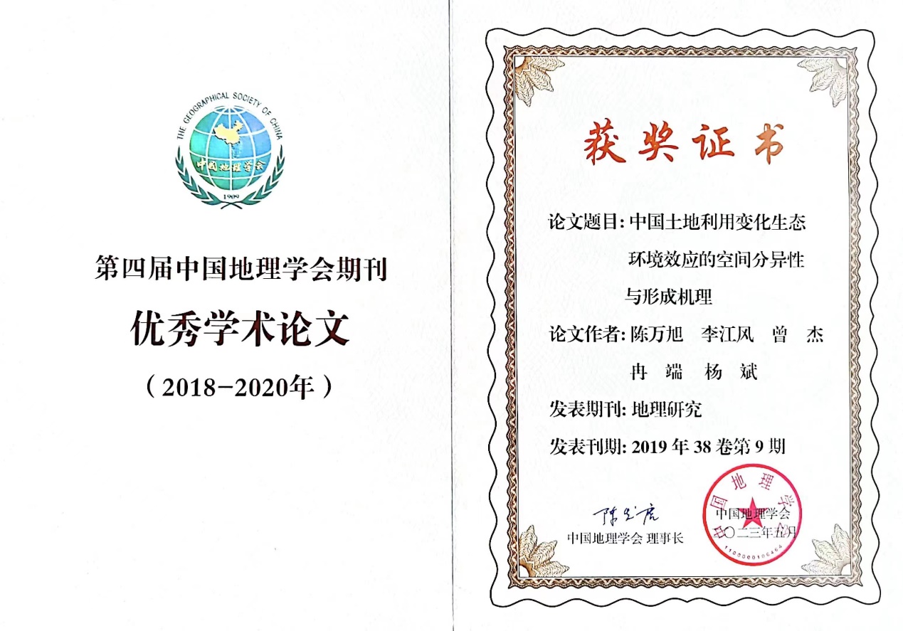 陈万旭副教授等撰写的《中国土地利用变化生态环境效应的空间分异性与形成机理》(地理研究,2019年第九期)荣获殊荣。