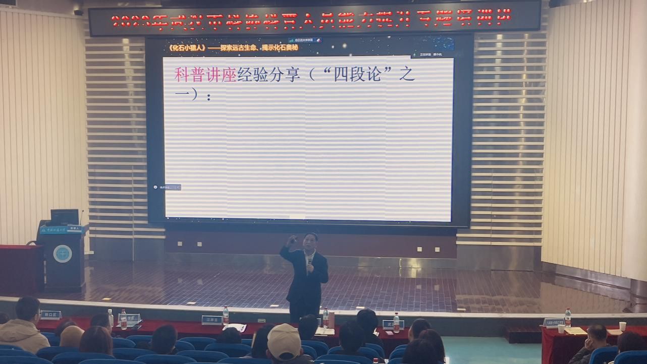 关庆锋致辞表示,科技助力科普发展,科普服务科技创新,科学普及能力是科普教育工作者做好科普工作的关键,而科普人员能力提升专题培训班是一个集科普能力展示、科普学习交流的重要平台,能够有效提升科普人员能力素质,增强武汉城市科普能力,是加强武汉市中心城区科普能力建设的一次重大科普活动,地信学院作为2023年新挂牌的武汉市科普教育基地,将大力支持此次培训活动,就“地学科普研学课程开发”、“地学科普活动组织与实施”等方面最新理论成果与大家展开交流。