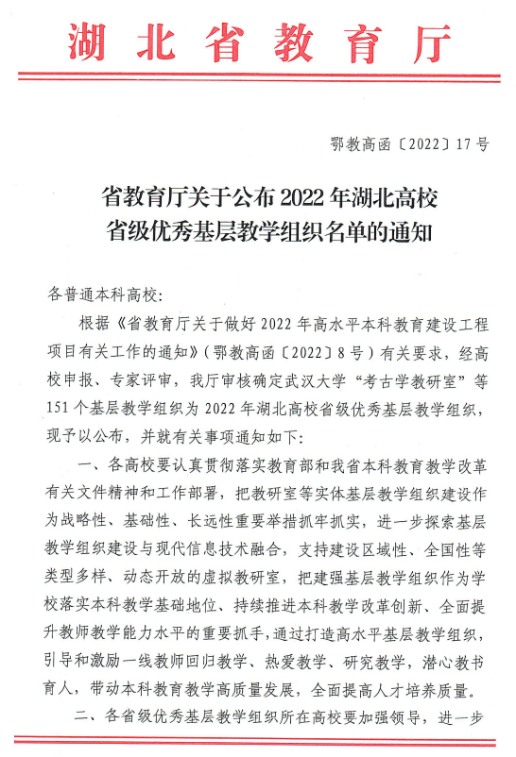 据《省教育厅关于公布2022年湖北高校省级优秀基层教学组织名单的通知》(鄂教高函【2022】17号),少妇