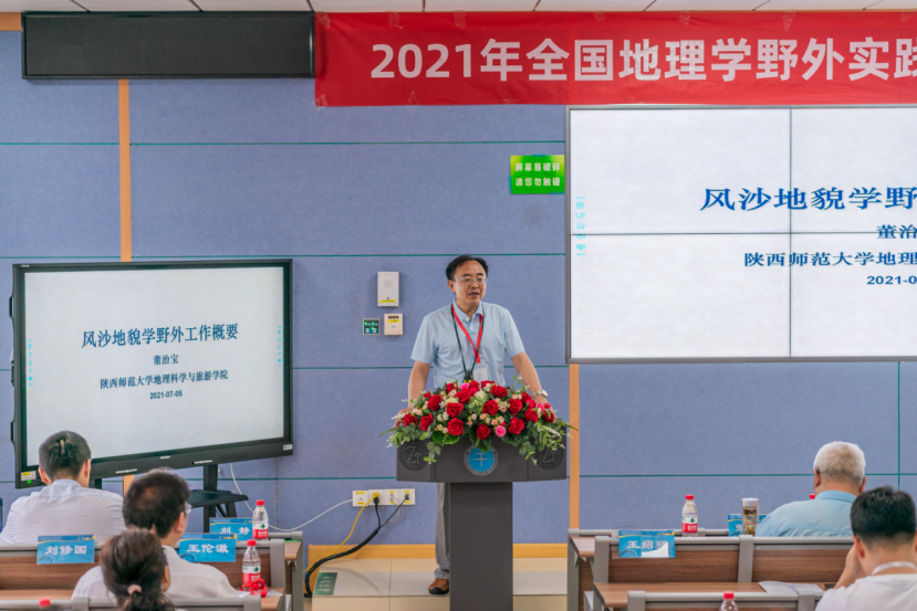 7月5日下午,中国地理学会副理事长、陕西师范大学副校长董治宝教授作《风沙地貌学野外工作概要》专题授课。课程内容主要围绕风沙地貌过程及学科发展、风沙地貌学野外考察工作展开,主要介绍了风沙地貌相关的形态学、沉积学、动力学原理和形成过程,并结合实例对风沙地貌的识别以及野外风沙观测方法进行了深入讲解。