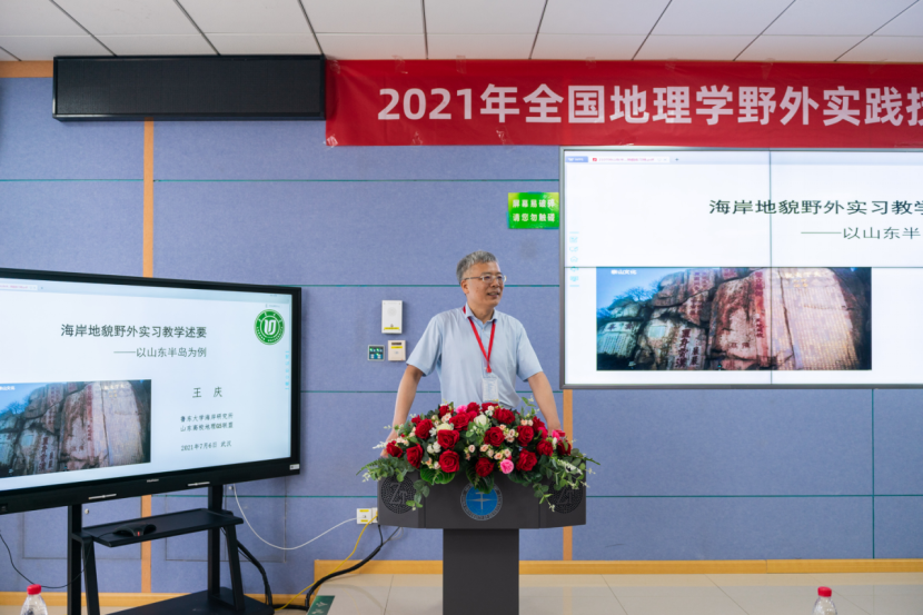 7月6日上午,鲁东大学校长王庆教授作《海岸地貌野外实习教学述要—以山东半岛为例》专题授课。王庆教授首先详细介绍了“为野外实习而诞生的联盟”——山东省高等学校地理G5联盟的组建情况,他指出,野外实习在新时代地貌教学中具有不可替代的作用。随后,结合山东半岛野外实习开展情况,依次分享了十大野外实习目的地,为本次的地理学野外实践技能培训班提供了案例指导。