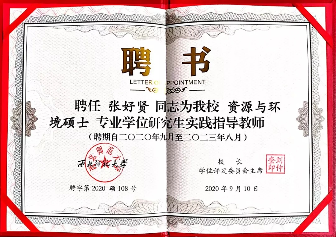 张好贤被西北师范大学聘任专业学位研究生实践指导老师