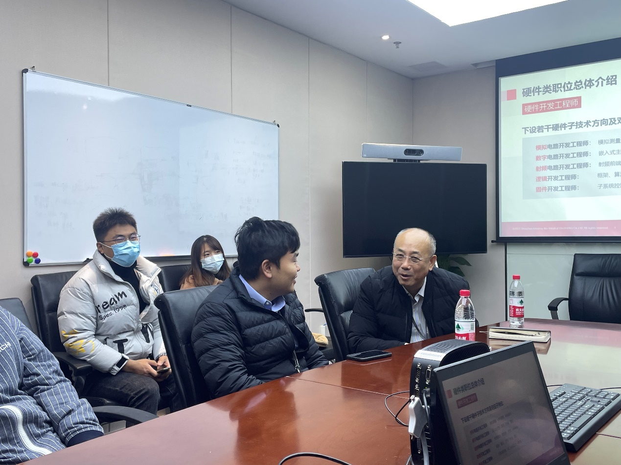然后在会议室向同学们介绍了迈瑞医疗的发展历程、发展状况、核心技术优势、人才培养等方面信息,加深同学们对公司的了解。