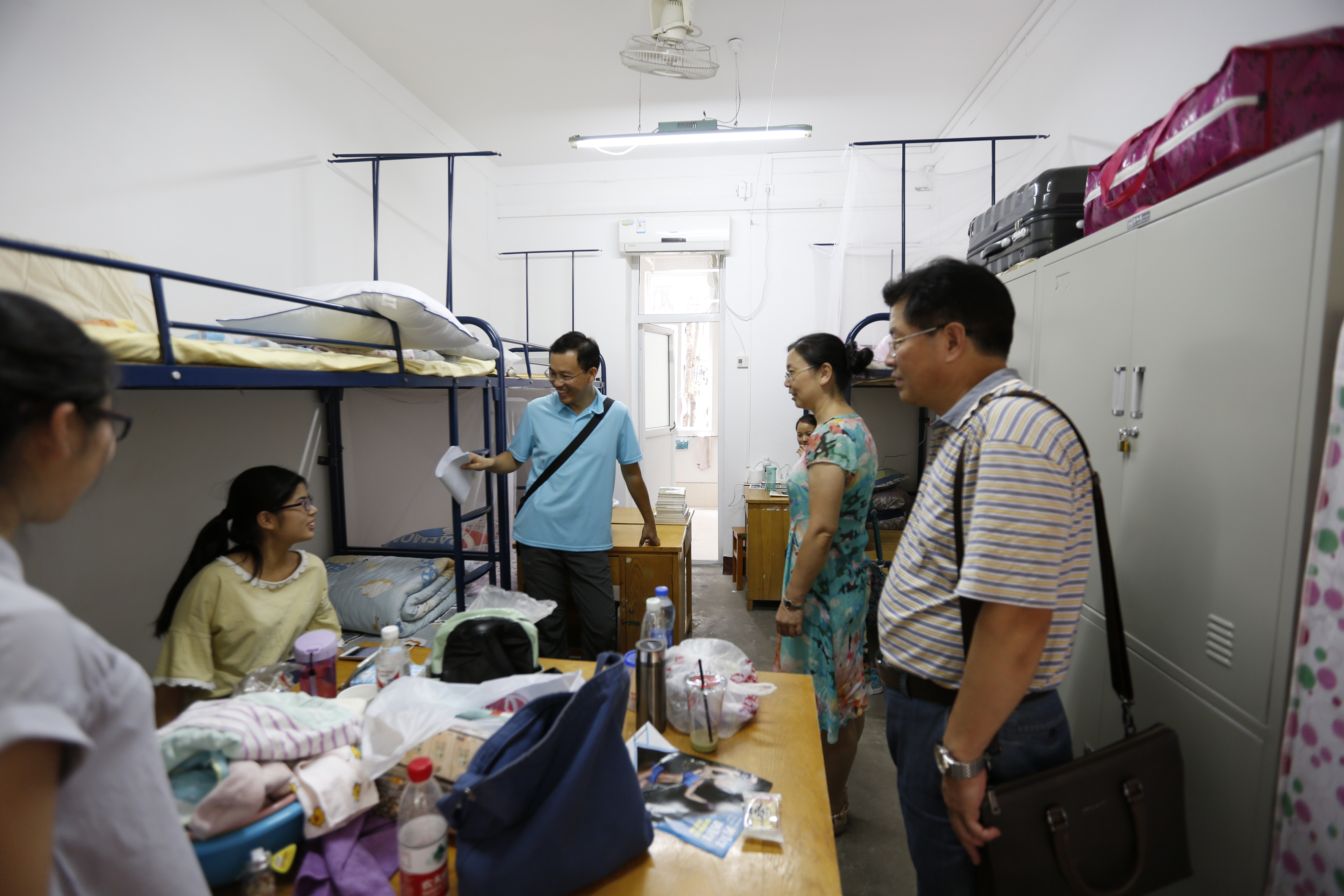 9月4日下午4点,为更好的了解新生入住情况,信工学院院长谢忠,党委书记黄菊,副院长胡友健,党委副书记许德华以及各年级辅导员一同走访慰问2016级全体新生宿舍。