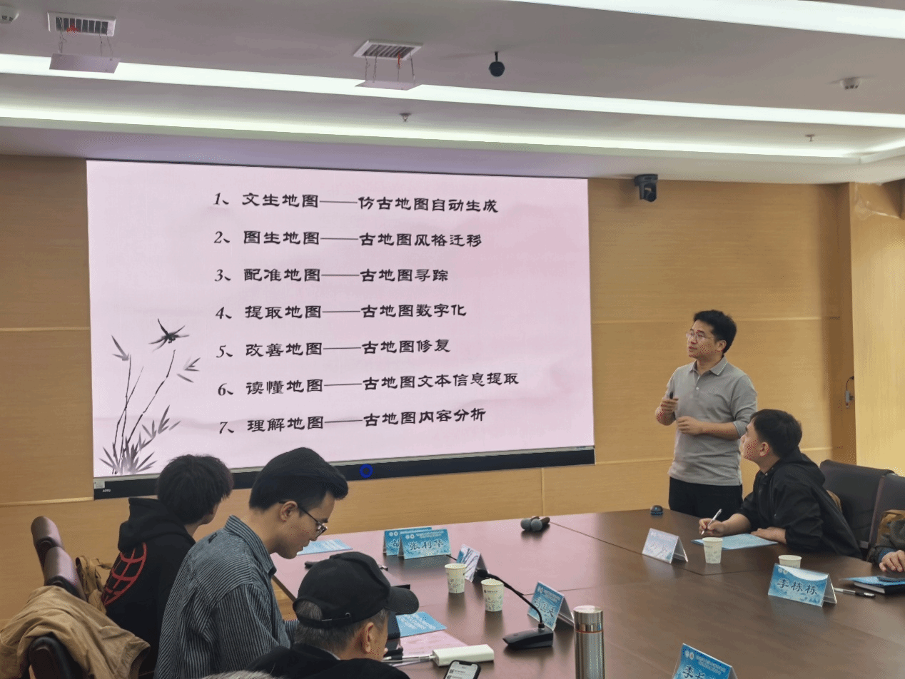 胡超涌、彭红霞、张利华、刘福江、林伟华、覃文敏、杨乃等教师参与交流互动环节,其中,杨乃副教授作了题为《人工智能赋能古地图研究》的报告。