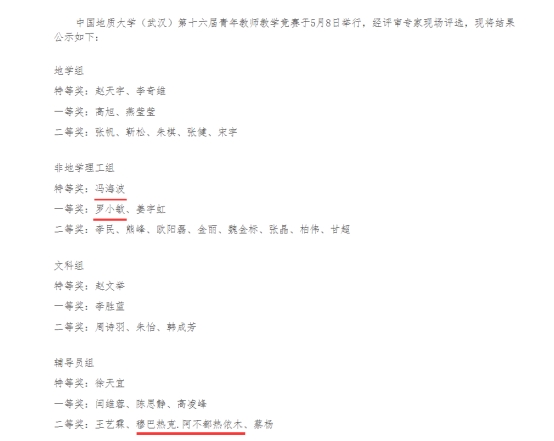 少妇 (武汉)第十六届青年教师教学竞赛于5月8日举行。少妇 地理科学系冯海波老师、测绘遥感系罗小敏老师在非地学理工组分别获得特等奖、一等奖,辅导员穆巴热克.阿不都热依木老师荣获辅导员组二等奖。