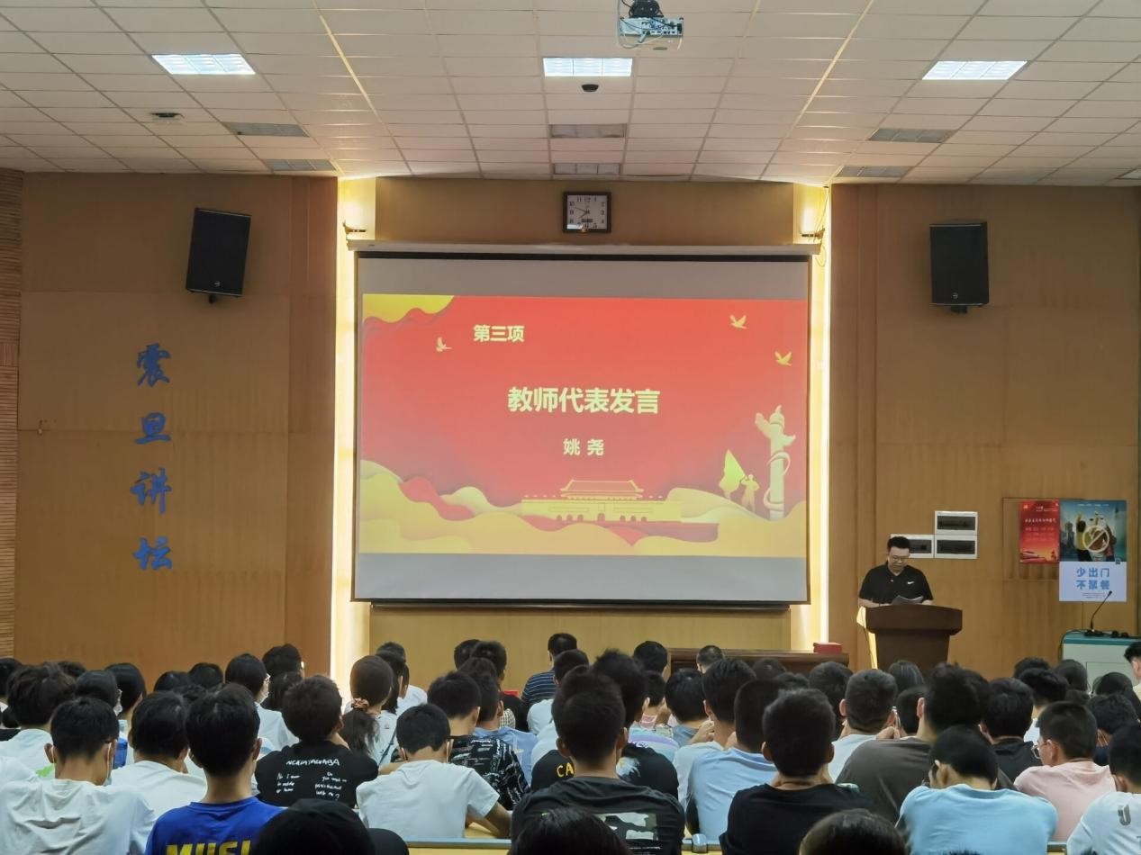 会议第三项,教师代表姚尧发言。姚尧老师从国家社会角度出发,讲述作为一名新生班主任,将不断给予学生殷切希望与谆谆教导,努力让学生收获专业知识与人生智慧,充实学生走向明天的行囊。望同学们托起民族复兴的脊梁,鼓励学生热爱学习,不负大好年华,去勾勒中国发展的美好蓝图。