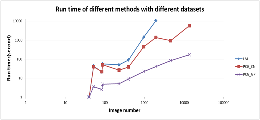 为了进一步解决大数据量带来的平差效率低下的问题,本文引入GPU并行计算技术,同时使用预条件共轭梯度法以及不精确牛顿解法求解区域网平差过程中的法方程,构建了适用于GPU并行计算的全新的区域网平差技术流程. 本方法避免了存储法方程系数矩阵,而是在需要的时候实时的计算该矩阵,使得本算法相较于传统的算法所需的计算机内存空间大幅减少(仅需要存储平差原始数据即可),平差计算速度明显提升,同时计算精度与传统方法相当。初步试验证明,本文的方法在普通电脑上仅需要约1.5分钟即可完成对4500张影像、近900万像点数据的平差计算,且计算精度达到子像素级。