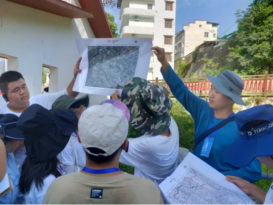 陈旭教授从该地区基岩的组成成分引入,介绍了张家冲小流域易发生水土流失的原因。随后,陈旭教授结合影像图和地形图分别介绍了张家冲小流域的地理位置及其地貌特征,分析了周边环境在图中的表示方法。现场师生围绕张家冲小流域影像图和地形图中地理要素的表达方法与陈旭教授展开讨论与交流。