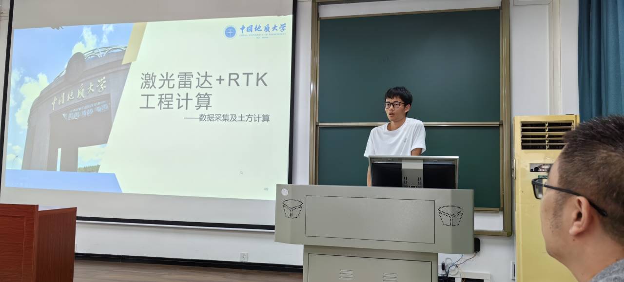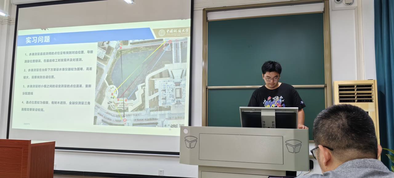 总结汇报期间,各实习学生代表围绕GNSS静态测量、跨河水准与三角高程测量比较、GNSS高程异常拟合、RTK测量与放样、巴东基地野外实习等内容展示实习小组工作成果,同时,对测绘工程专业的课程建设、实习内容提出建议。