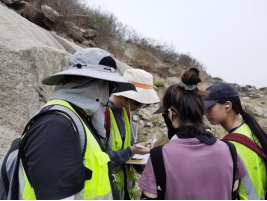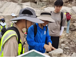 “艰苦朴素、求真务实”的校训精神,野外紧跟老师步伐,认真听讲,细致观察野外现象,勤于思考,积极提问并与老师讨论相关地质现象成因等。与此同时,同学们在野外实习记录簿(简称野簿)上完成点号、点位、点义、露头和描述等重要知识点的速记。大家积极动手,学习和熟练掌握野外基本工作技能,包括产状测量、岩石标本采集、信手剖面图绘制及各种地质现象的素描图等工作。