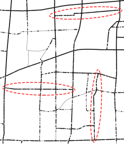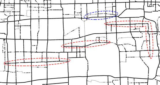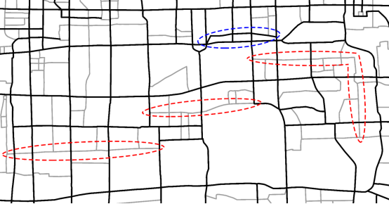 基于以上思想,接下来的问题便是如何量测弧段间的功能联系。本文通过引入交通大数据的出租车轨迹流,判断弧段间是否存在显著的交通流;若存在,则认为弧段间具有较强的功能联系(图1),在地图综合过程中,需同时保留或删除相应弧段,以最大程度还原真实场景下人们的路径选择(图2)。