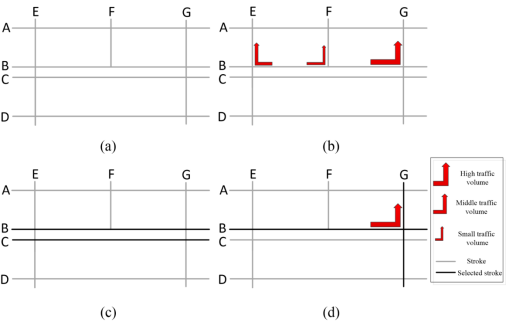 图2 传统几何算法与本文改进算法的对比示例(图c为传统方法选取结果,图d为改进算法选取结果:弧段 B和G之间的交通联系较强,则两条道路需同时被选取,以保持高频通行路线的完整性;而传统算法仅考虑几何和拓扑属性,选取拓扑指标值较大的B和C)