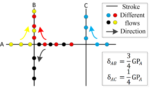 图1 弧段间交通功能联系构建的示意图(三辆车从弧段A流向弧段B,一辆车从A流向C,其表明A与B的交通联系强于A与C)
