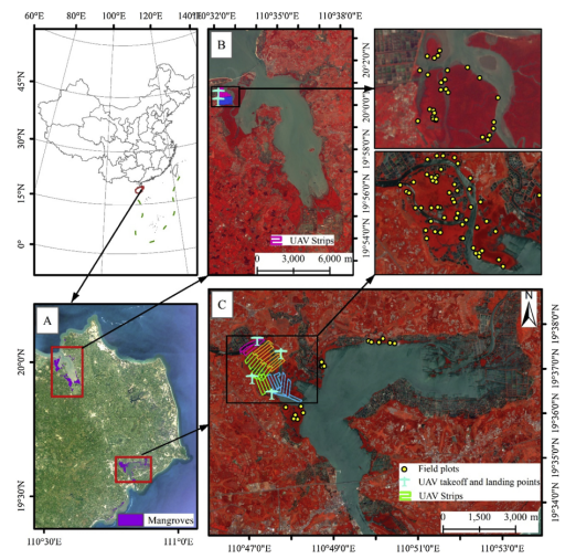 海南岛东北部地区红树林是中国红树林树种最丰富的森林,由东寨港国家级自然保护区和清澜港省级自然保护区组成。前者是中国第一个国家级红树林自然保护区,后者是中国红树林树种最丰富的自然保护区。但是,由于该地区红树林群落复杂以及在红树林中进行大量的野外采样十分困难,迄今为止,尚未有研究对该地区红树林地表生物量进行估算。尽管三维点云可以捕获森林的垂直结构,但是当它们应用于大范围时受到逻辑、成本和数据量上的限制。为了填补这一空白并解决这一问题,本研究提出了一种新的红树林地表生物量尺度上推估算方法。