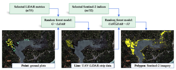 该尺度上推方法基于一种点-线-面框架(point-line-polygon),使用野外样方、无人机激光雷达条带数据和Sentinel-2影像构建(命名为G〜LiDAR〜S2模型)。在G〜LiDAR〜S2模型中,部分覆盖的无人机激光雷达(UAV-LiDAR)数据被用作为线性桥梁,以连接地面样方测量结果与全覆盖的Sentinel-2数据。