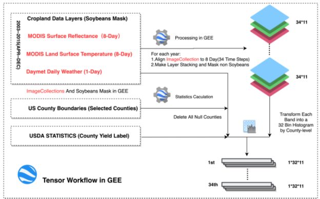 Earth Engine (GEE),将所有这些训练数据合并并转换为基于直方图的张量进行深度学习。实验结果表明,所提出的CNN-LSTM模型无论是季末还是季内预测性能都优于单纯的CNN或LSTM模型。该方法在提高玉米、小麦、马铃薯等作物未来精细尺度产量预测的准确性方面具有很大的潜力。