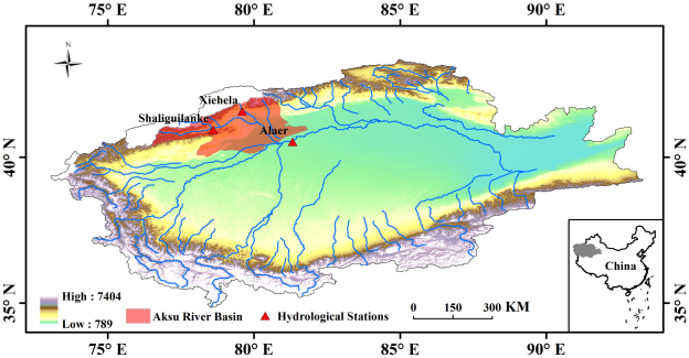 塔里木河流域地处亚欧大陆腹地,是一个典型的纯耗散性流域。该流域众多的冰雪融水从山区流向中下游,成为该流域径流形成、中下游绿洲农业系统和生态系统的主要水源(图1)。然而,随着人口的增长和经济的发展,该流域上游绿洲农业面积不断扩大,因而也导致该区域农业用水急剧增加,甚至严重挤占了上游向中下游的输水量,从而导致中下游生态可用水量减少,出现生态退化、土壤沙化等问题。尤其是2009年,塔里木河干流出现了历史上断流持续时间最长、断流河段距离最长的严峻形势。虽然前人也对塔里木河流域的干旱问题做出了相关研究,但是前人很多干旱研究集中于气象干旱的研究上或者单纯着眼于一个径流的时间序列上,而不考虑塔里木河流域靠径流发展绿洲农业的事实和水资源系统供需矛盾。