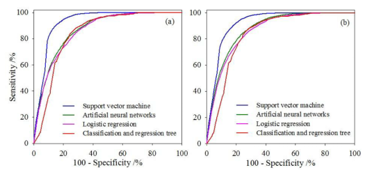 Figure 2. The ROC curves of the SVM, ANN, LR and CART models in landslide susceptibility assessment: (a) training and (b) verifying.