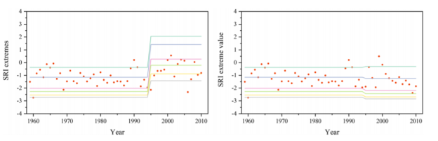 依据变点,训练人工神经网络重构天然的径流序列。采用非平稳的广义极值模型拟合实际和重构的标准径流指数(SRI)。提取实际SRI序列和重构SRI序列的0.1、0.5、0.9、0.95、0.98和0.99分位数和SRI样本点。