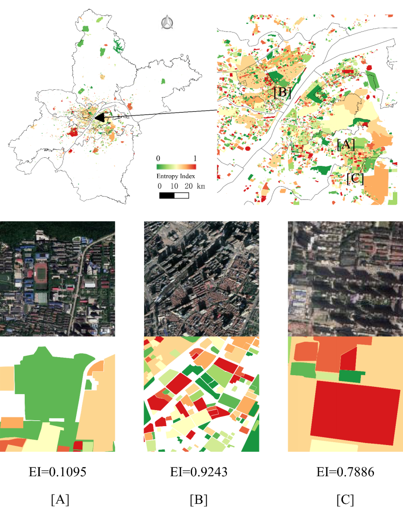 【图2 武汉市地块尺度的职住属性混合熵分布结果:(A)少妇