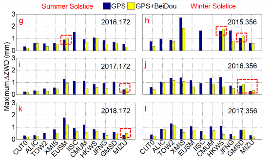 论文统计了2015年至2018年的二分二至日,二阶电离层延迟对ZWD影响的最大值,并且测站按纬度升序进行排序,结果如图3所示。高纬度测站的最大值小于低纬度测站的最大值。在大多数测站,GPS和BDS结合使用的影响要小于单独使用GPS。