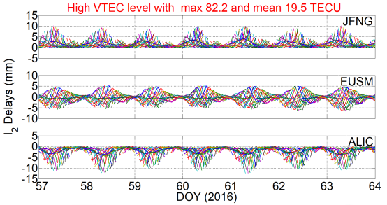 图1. 测站JFNG、EUSM和ALIC活跃期(上)和非活跃期(下)的二阶电离层延迟