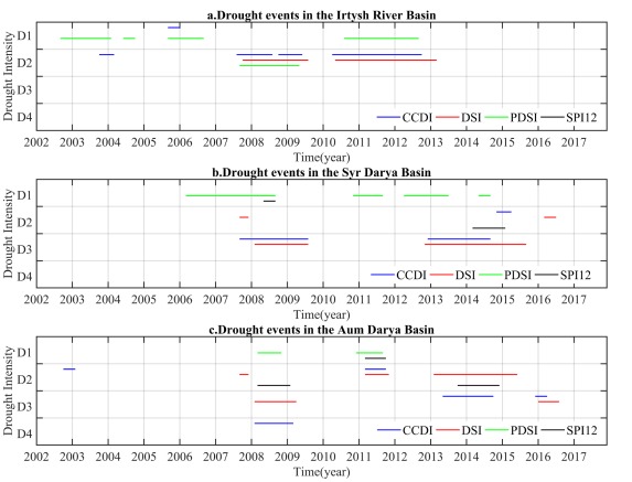 图5 中亚主要流域基于CCDI反演的干旱事件
