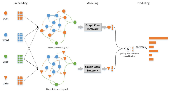 用户在社交媒体上发表的信息中,单词与帖子间存在固定的构成规律和语法规则,不同帖子间的单词也存在着关联关系和分布特征。除此之外,不同用户还影响活动信息的生成和传递。这些不同类别的信息通过社交网络进行组织和连接,存在丰富的结构特征。利用图神经网络将这些信息融合起来,建立合适的模型对融合后的信息进行处理,能极大促进用户活动的识别任务。在利用单一活动信息识别用户活动的问题中,多种类别的信息意味着更多的特征组合,在模型特征不足的情况下,通过其它知识的辅助和补充,能大大提高模型的性能和鲁棒性。这类外部知识不只包括额外补充的语义信息,同时包括活动信息自身固有的,未被挖掘的结构关系特征。