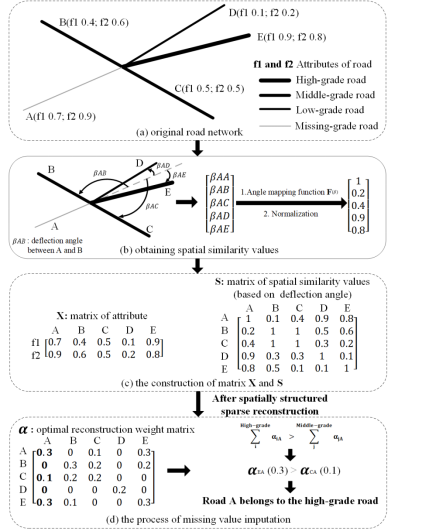 空间数据包含大量的冗余特征和关系,部分目标虽然与多个目标邻近,但具有真正相关关系的目标可能只占少数,而且数量也会有所不同。过滤数据中存在的冗余特征,对下游任务的开展非常有益。例如,利用相对较小且关键的数据维度,来降低数据的复杂性。但传统研究主要关注冗余特征的细化,而对于空间关系的细化,少有研究涉及。为了解决现有技术的不足,本文提供了一种结合空间结构和属性信息的自适应邻域确定方法(图1),利用稀疏重建的思想,在稀疏正则项约束下保证重建前后的空间和非空间特征的相似性,并压缩数据中的冗余关系,找出与目标真正相关的邻居。本文以空间数据挖掘的缺失值填充(图2)以及地图综合的建筑物模式分类(图3)为例,说明该方法对多个领域均有重要的潜在价值。