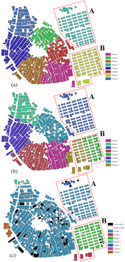 (图a为基于本方法的聚类结果,图b为基于传统邻域分析的聚类结果,图c为基于自然邻域方法的聚类结果)