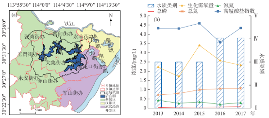 Fig.2 Lake Houguanhu regional location and administrative division(a),its water quality(from 2013 to 2017)(b)