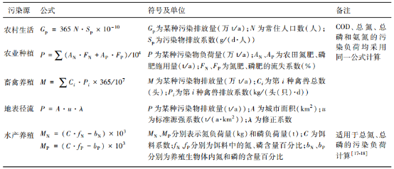 本研究采用实测法监测后官湖周边工业污染源、城镇污水处理厂等稳定排放口的污染物排放量;部分未经集中收集和处理的污水渠道为非稳定排放,如城市地表径流,这部分污染通过实测法测得一定时间内的污染物浓度与流量,再经平均浓度法估算全年排放量;同时,后官湖流域内,存在诸多的村庄、有一定规模的农村养殖业和农业生产,这些污染源的排放具有典型的面源性质,通过排污系数法进行核算,计算方法如表1所示。 实际入河量除以计算污染排放量得到入河系数,再参考相关研究,入湖系数的研究成果,确定后官湖流域不同污染源的平均入湖系数,如表2所示