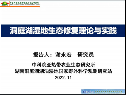 谢永宏研究员从洞庭湖区域概况特点和国家发展需求出发介绍了洞庭湖湿地退化现状及成因,强调了人类干扰对湿地生态系统退化的影响以及协调发展和保护的矛盾问题的关键性。因此基于生态修复理论该团队进行了洞庭湖湿地植被格局及关键调控因子、三峡工程对植被格局的影响机制、湿地植被群落构建及其环境调控机制、典型湿地植被对环境胁迫的适应性响应、外来物种杨树入侵的环境学效应和水鸟分布格局及其栖息地特征等研究。在此基础上该团队为实现湿地生态修复目标研发了物种筛选、湿地植物快繁、湿地植物建群及检测和评估等湿地生态修复关键技术。最后,谢永宏研究员介绍了基于候鸟多样性保育的生态修复模式、基于候鸟栖息地改善的湖滨沼泽修复模式和生态矮围的水鸟保育功能的三个湿地生态修复案例。