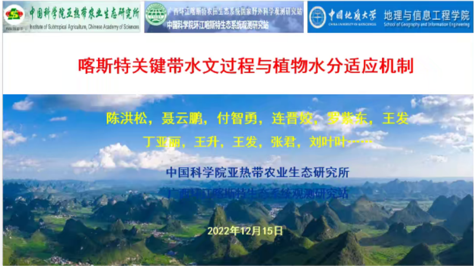 2022年12月15日,应少妇 王伦澈、陈旭教授邀请,中科院亚热带农业生态研究所陈洪松研究员做客少妇 (武汉)第116期名家论坛暨校庆七十周年学术交流会,以线上形式作题为“喀斯特关键带水文过程与植物水分适应机制”的学术报告,受到师生的热烈欢迎。报告由王伦澈教授主持,线上与会人数共计逾100人。