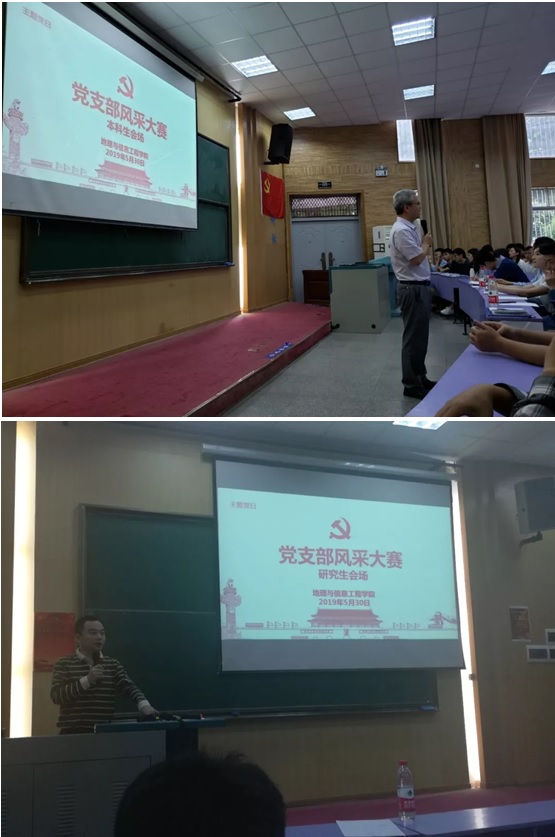 (武汉)地理与信息工程党支部风采大赛在教三楼110、111教室拉开帷幕。地理信工学院党委书记许德华老师、党委副书记武彦斌老师、学工处徐伟老师、校团委霍少孟老师等莅临现场指导工作,学院各年级百余位同学参与大赛的评审和观看。