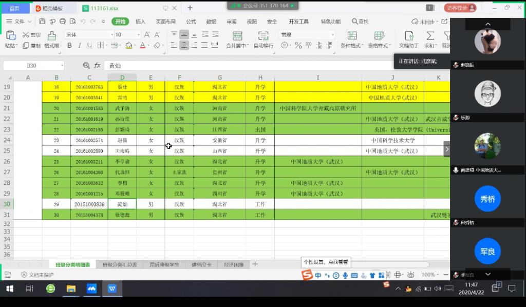 武彦斌介绍2020届毕业生的升学就业情况。他按照“保研学生”、“考研学生”、“出国学生”、“考公学生”、“企业就业学生”、“就业困难学生”、“少数民族学生就业”等七个类别,对15个本科生班级就业情况依次进行了详细介绍。