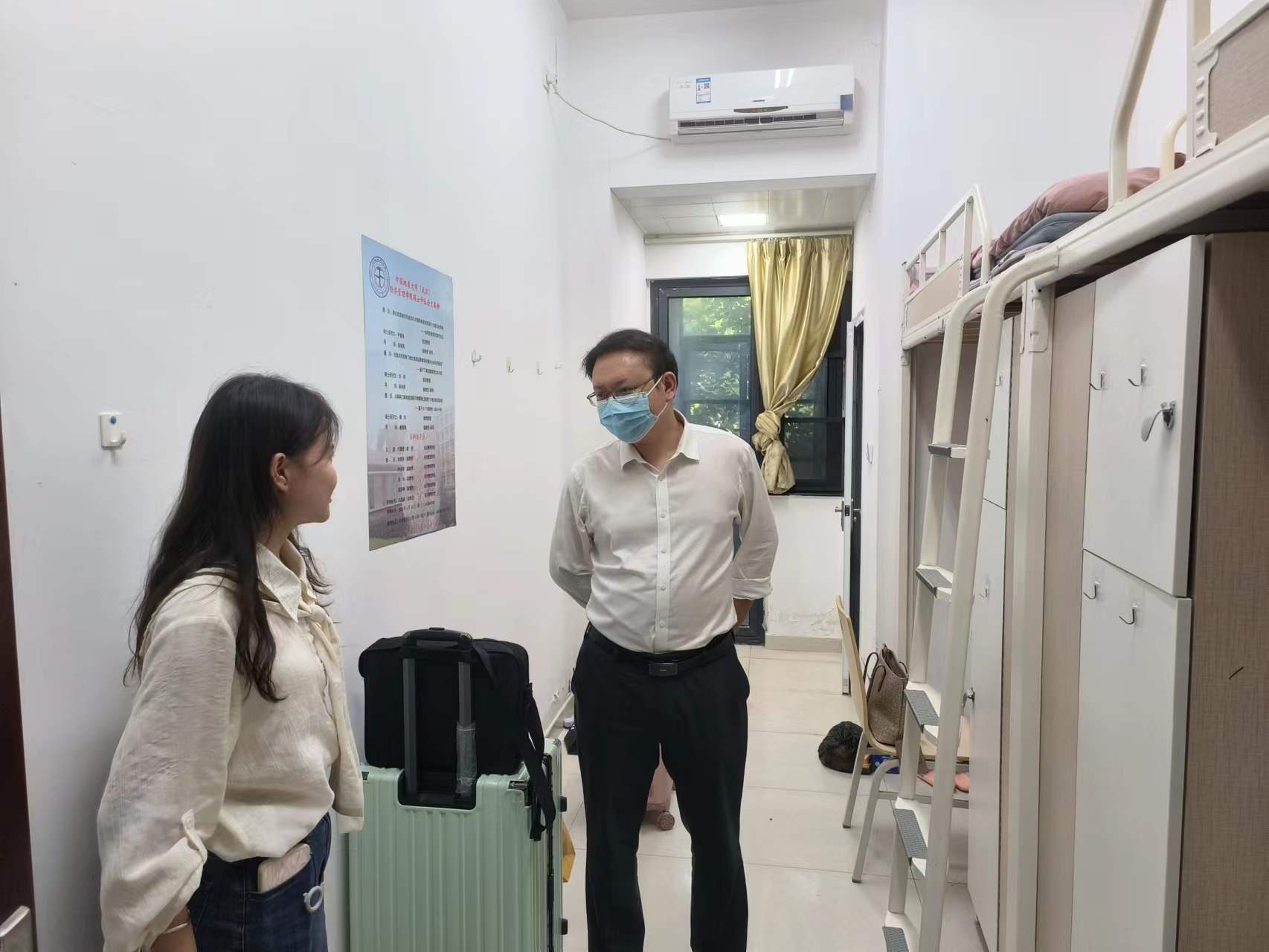 刚入学的2022级新生进行走访慰问。在走访过程中,老师们亲切地和新生们打招呼,仔细询问新生的生活习惯、在校饮食以及住宿事宜等情况。在与新生交谈中,院领导强调了宿舍卫生、用电安全等注意事项,同时,他希望新生们尽快适应新生活,保持良好的生活习惯,积极与导师沟通交流,根据职业发展规划提前制定学习计划,广读书、勤思考、多练笔,以昂扬向上的精神状态投入到新阶段的学习中去,用优良的成绩回报家长和社会。